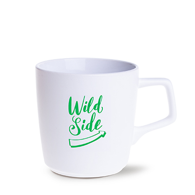 En vit mugg med ett karakteristiskt polygonalt handtag.