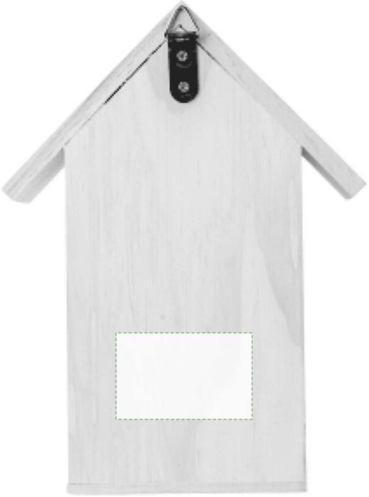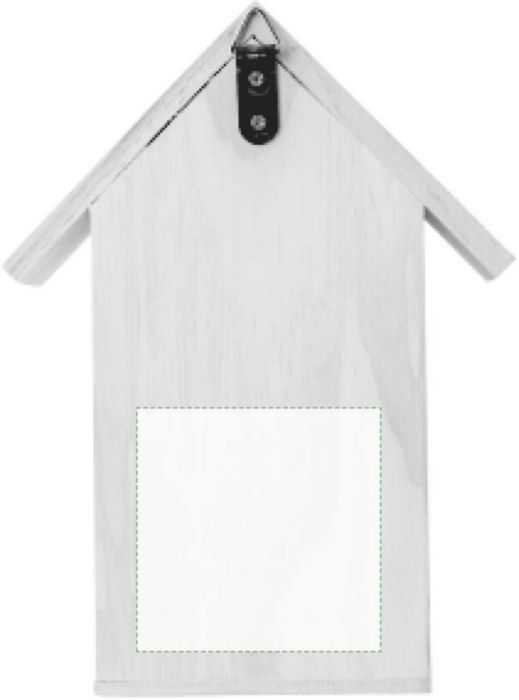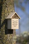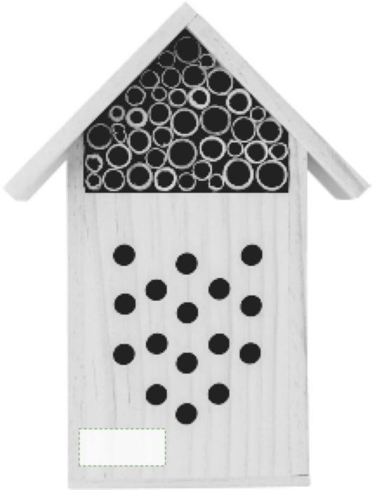 Hus till bi i trä (furu och vass) med metallkrok på baksidan för att montera. Förpackad i presentförpackning.