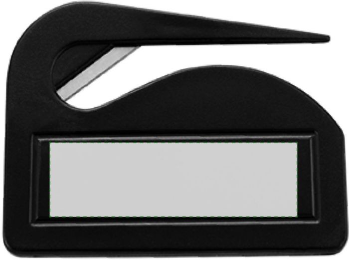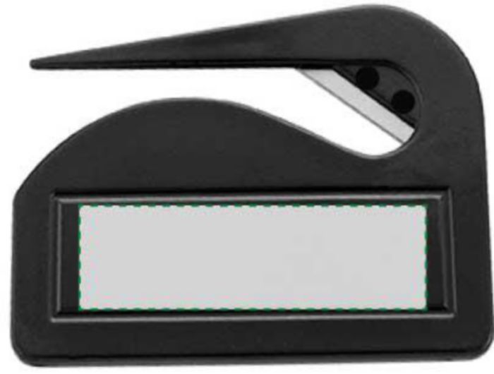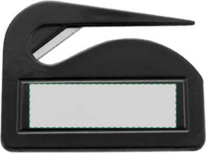 Enkel brevöppnare med stor tryckyta och skärkniv i metall.