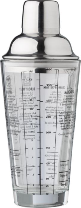 Cocktail shaker i glas (400 ml) med lock i rostfritt stål (S/S304). Recept på cocktails förtryckta på sidan.