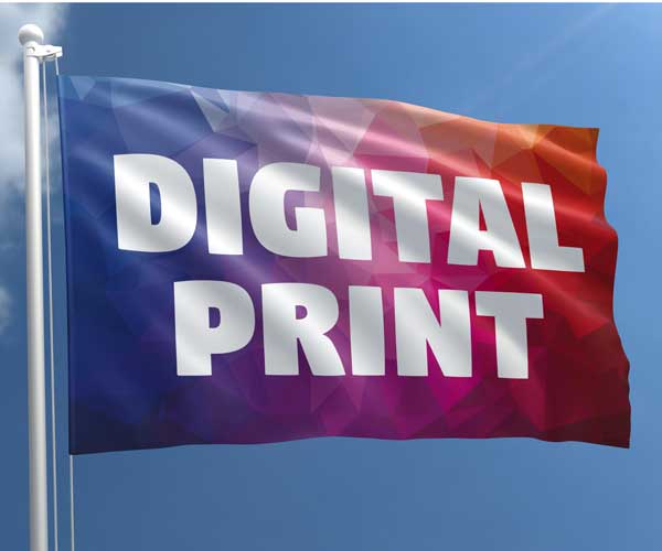 Digitaltryckt flagga i 120 g stickad polyester. Levereras med karbinhakar. Vi tillverkar enligt önskad storlek och design.