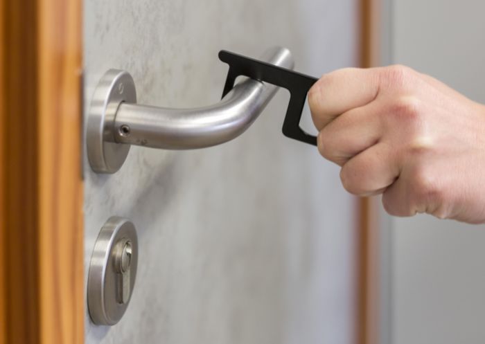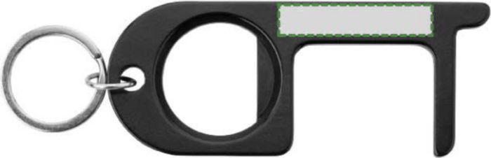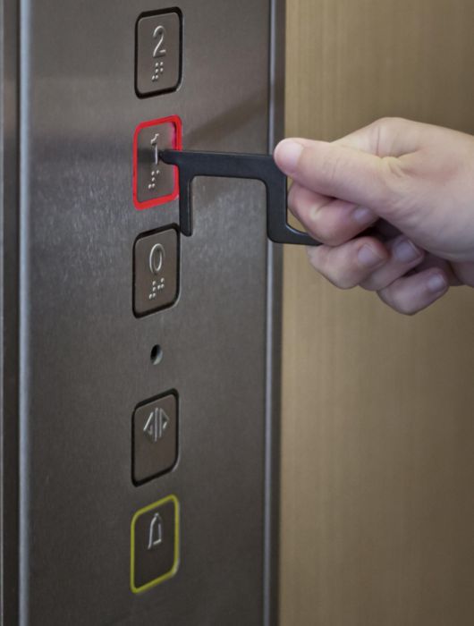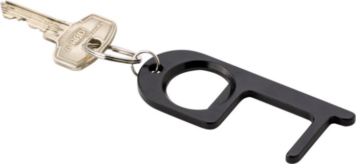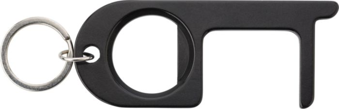 Dörröppnare och kapsylöppnare i aluminium. Används för att öppna och stänga dörrar, för att slippa röra dem.