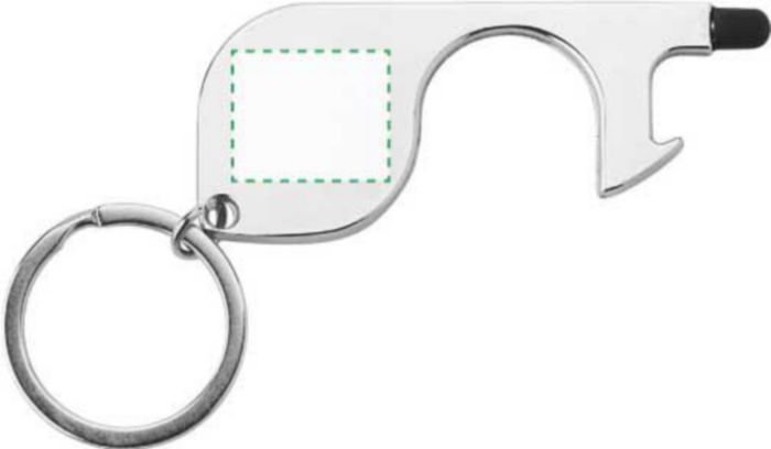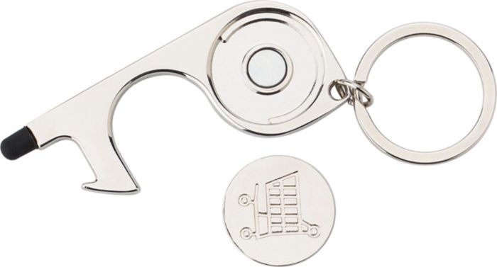 Dörröppnare/Hygiennyckel i metall med gummispets för kapacitiva skärmar, nyckelring och vagnmynt.