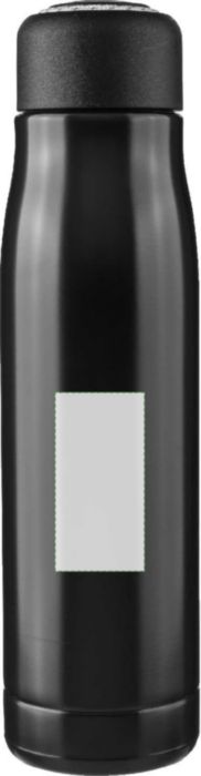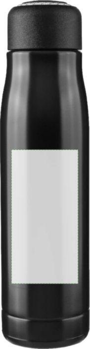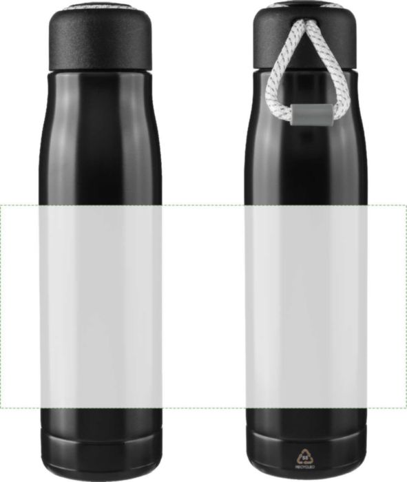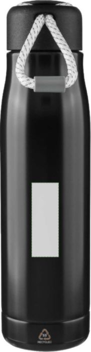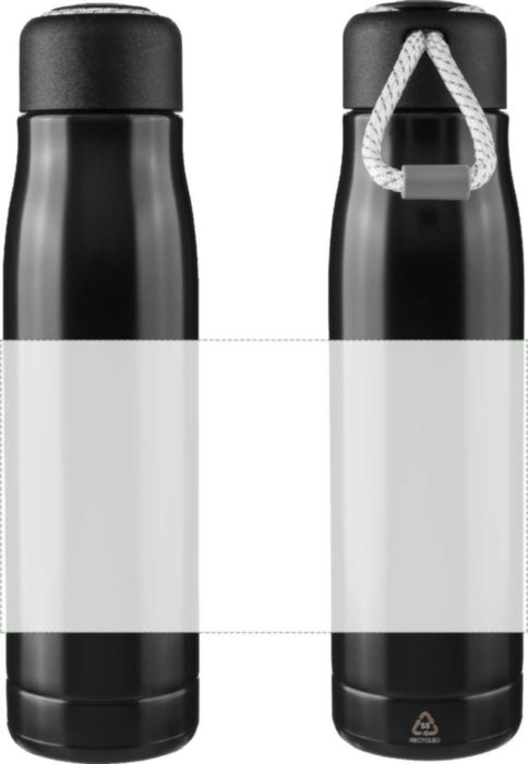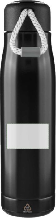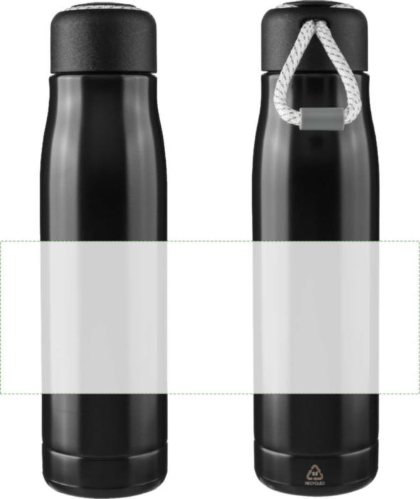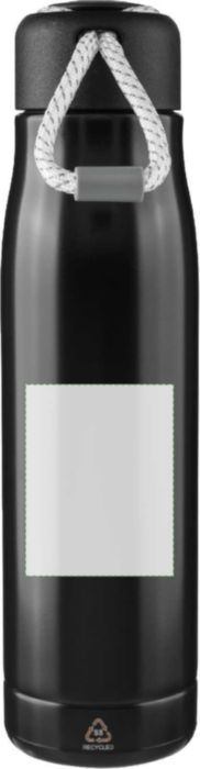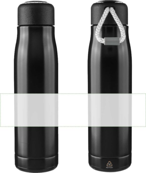 Dubbelväggig vakuumflaska i återvunnet rostfritt stål (500 ml) med insida i rostfritt stål 304 och utsida i rostfritt stål 201. Har skruvlock i PP och polyesterlina. Utformad för isolering och vardagsbruk. Inkluderar en graverad logotyp i återvunnet stål. Silverfärgad version finns tillgänglig till lägre pris. Individuellt förpackad i brun kartong.