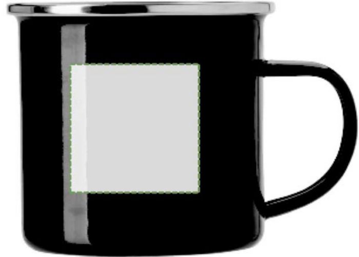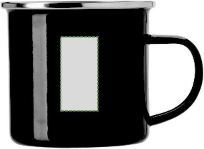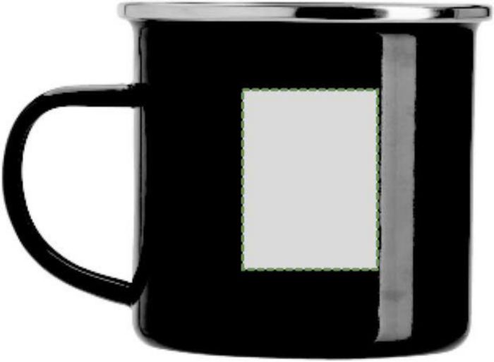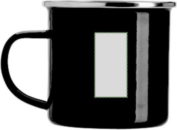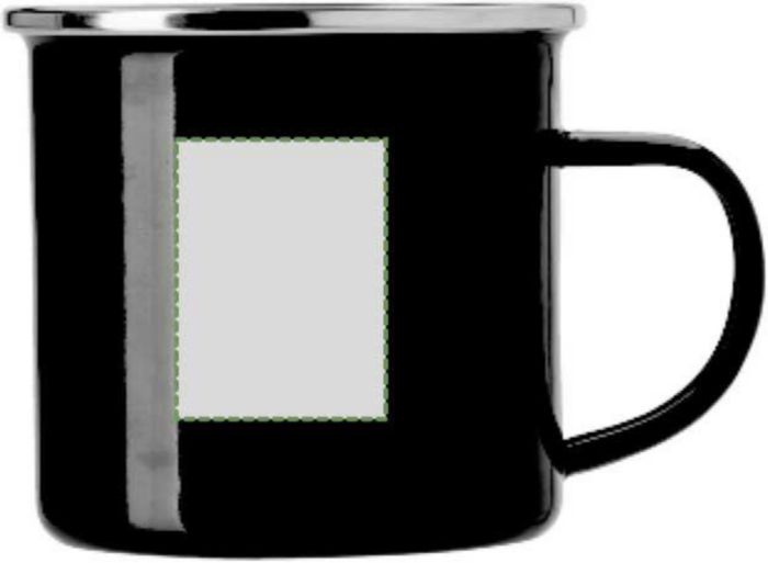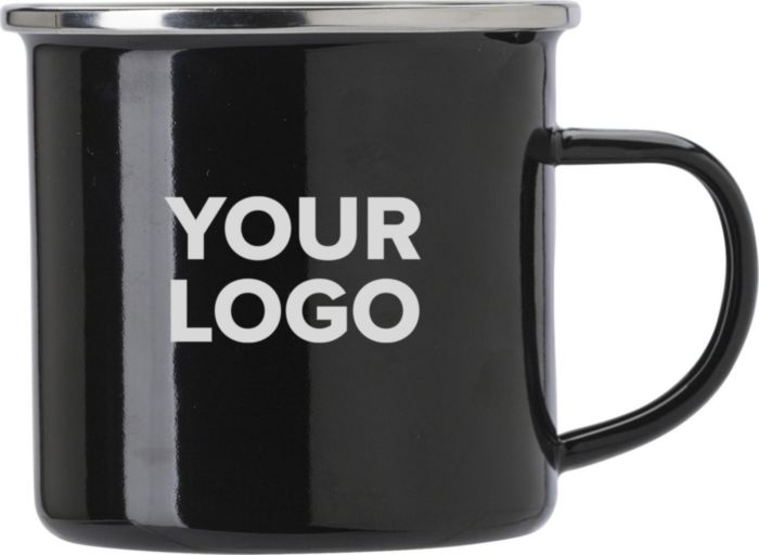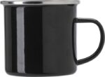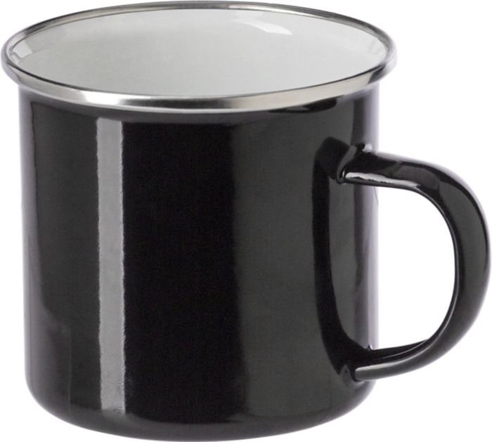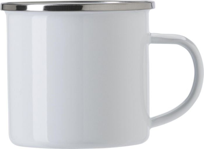 Emaljmugg (350 ml) med kant av rostfritt stål. Separat packad i ask av brun kartong.