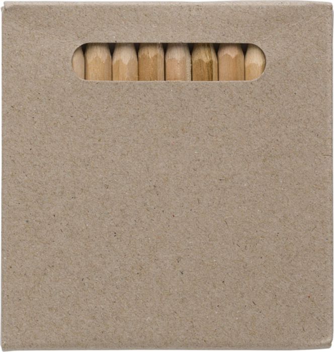 12 st små färgpennor i pappask. Pennorna är tillverkad i trä och pappersasken kan återvinnas.