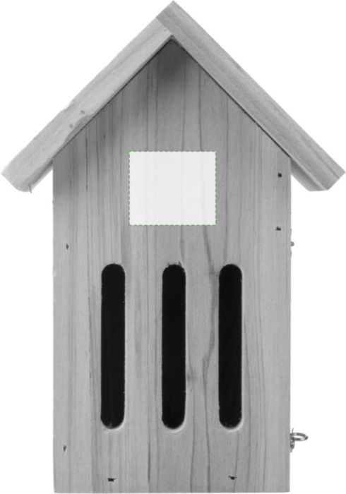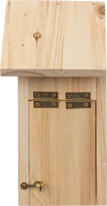 Fjärilshus i furu med fyra öppningar på framsidan. Den har en hängkrok i metall för att fästa huset på väggen. Individuellt förpackad i brun kartong.