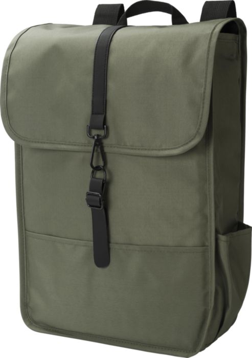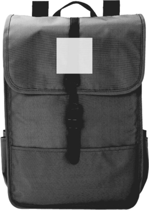Flap-ryggsäck av RPET-polyester (300D). Två flaskfickor på sidorna. Ett stort fack. Med svart PU-rem och stängningsspänne.
