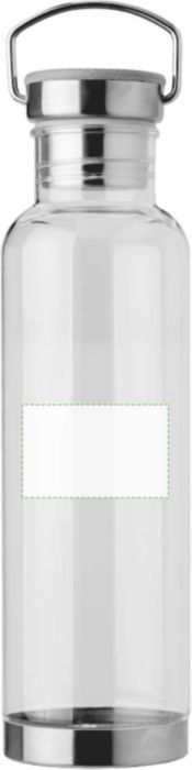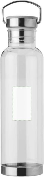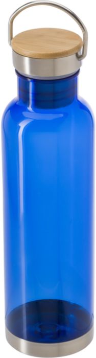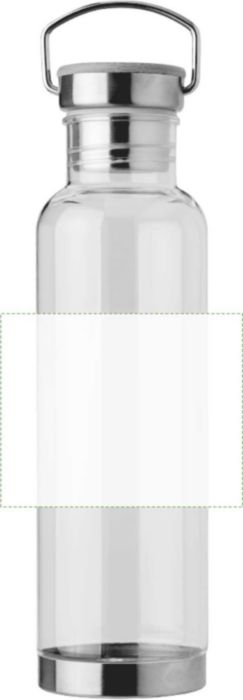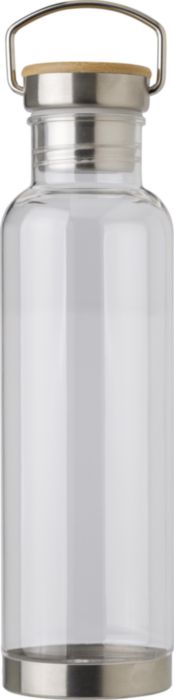 Flaska i Tritan (800 ml) med botten och kork i rostfritt stål och bambu. Roterbart handtag. Separat packad i ask av brun kartong.