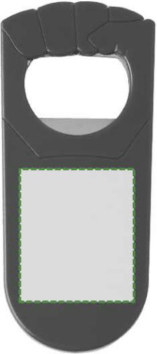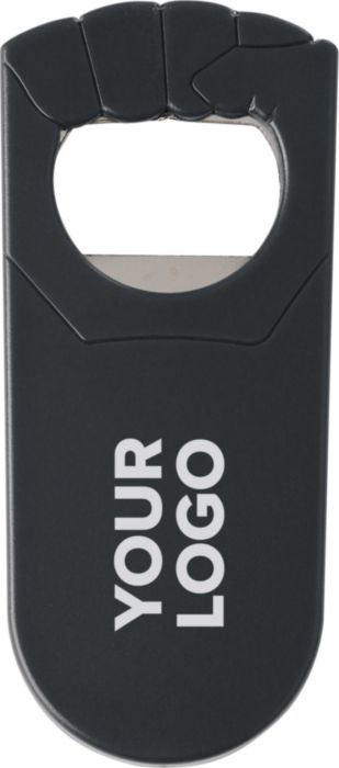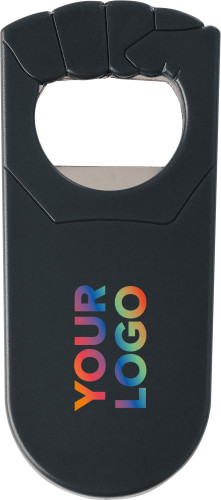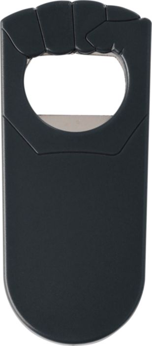 Kapsylöppnare i plast och metall, formad som en knuten hand.