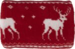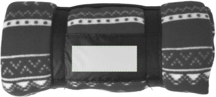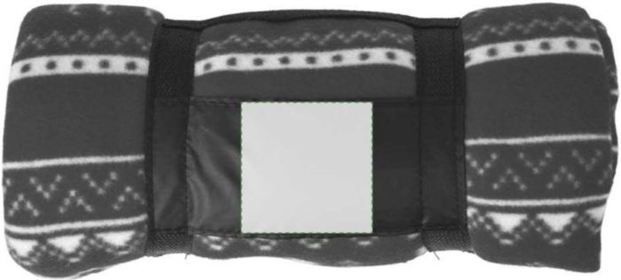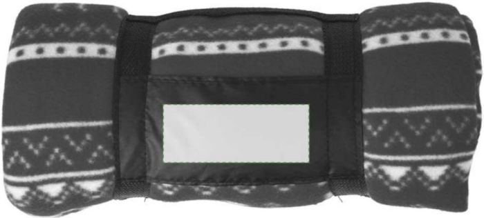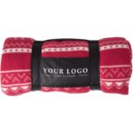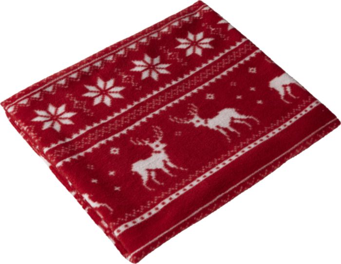 Pläd i polarfleece av 100 % polyester med julmönster. Fästs ihop med svart polyesterband.
