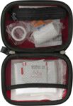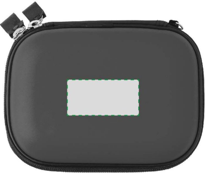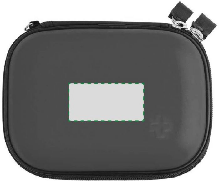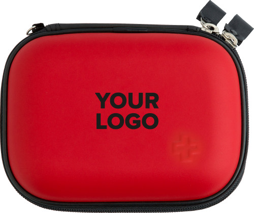 Första hjälpen set i fodral av konstläderbeklädd plast med dragkedja. Setet innehåller: 1 kompresser, 1 gasbinda, 1 triangelformat plåster, 2 säkerhetsnålar, 1 sax, 4 alkoholtvätt, 5 plåster och 1 rulle sår tejp.