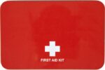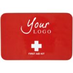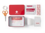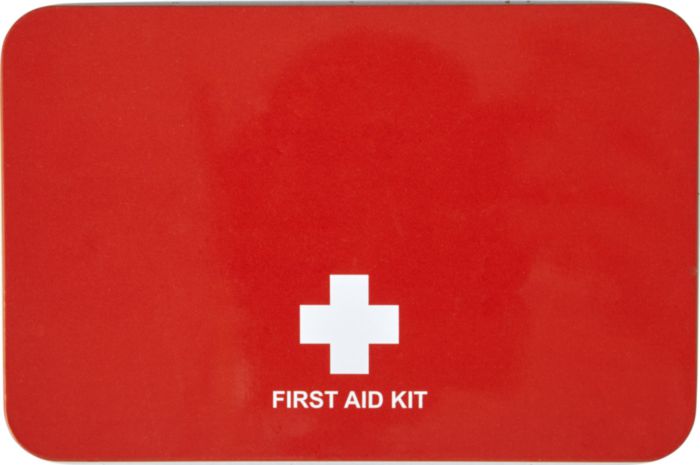 Första hjälpen-set i metallbox, bestående av 15 delar: sax, kompress, tejp, 4 desinficerande servetter, 5 plåster, 1 bandage och 1 antiseptisk servett.