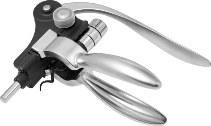Gåvoset för vin bestående av nio delar i rostfritt stål: två korkar, droppfångar, termometer, folieskärare, tratt och korkskruv.