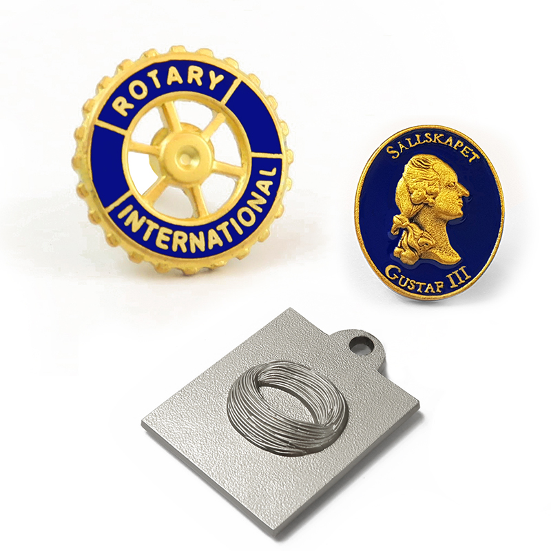 Metallmärke med stiftlås på baksidan. Passar design med 3D-logo, kan även tillverkas med håligheter.