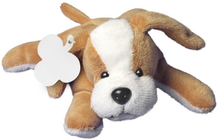 Hund mjukisdjur i plysch. CE-märkt. Dock ej lämplig för barn mellan 0-3 år. Märkning kan göras på en rondell som är fäst i örat.