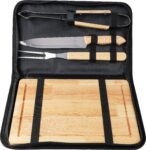 Grillset i rostfritt stål med trähandtag. Verktygen inkluderar en kniv, gaffel, tång och en skärbräda i trä. Förpackad i en 300D polyesterficka med dragkedja och en framficka.