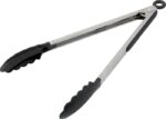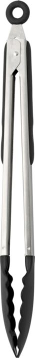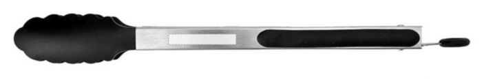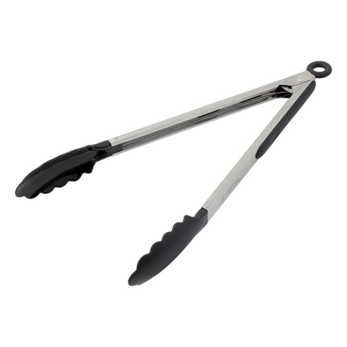 Grilltång i metall med greppytor av svart solidfärgad värmeresistent plast. Tången har även en ögla av plast för upphängning.