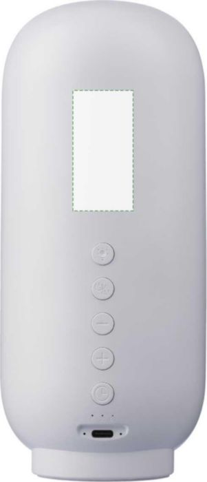 3-i-1-högtalare i återvunnen ABS och rPET-tyg med ljusfunktion och sömnterapi. Har en 3W-högtalare, trådlös teknik (version 5.3) och ett 1 200 mAh litiumjonbatteri. Utrustad med fyra varma LED-lampor och sex lugnande sömnljud: Stream, Brahms vaggvisa, Havsvåg, Stilla natt, Fosterljud och Vitt brus. Erbjuder tre ljusstyrkenivåer och en timer med inställningar på 15, 30 och 60 minuter. Växla enkelt mellan trådlöst och vitt brusläge med hjälp av kontrollpanelen med fem knappar på baksidan. Inkluderar en 1 meter lång vit laddningskabel. Individuellt förpackad i en kraftpappersask.