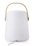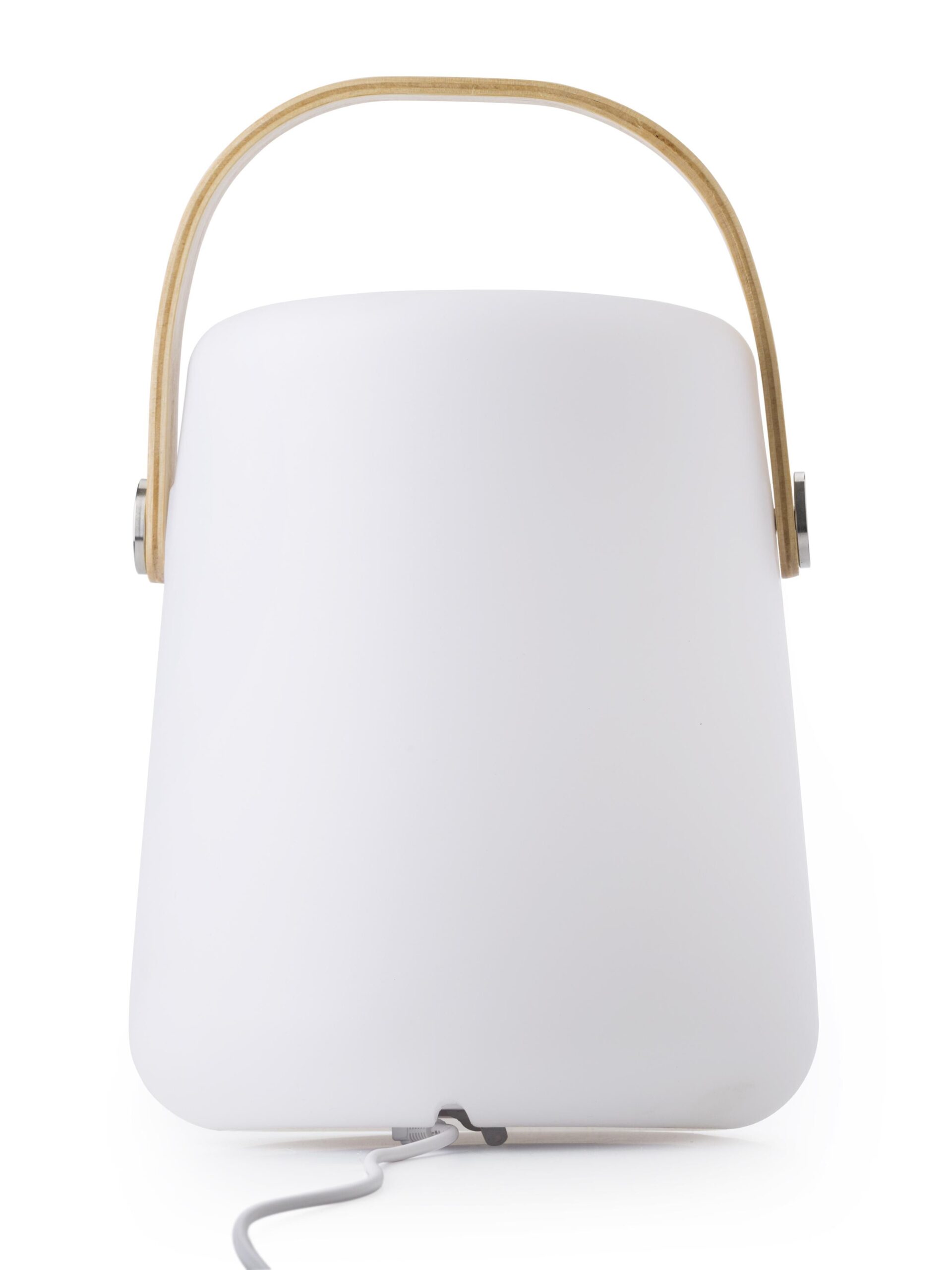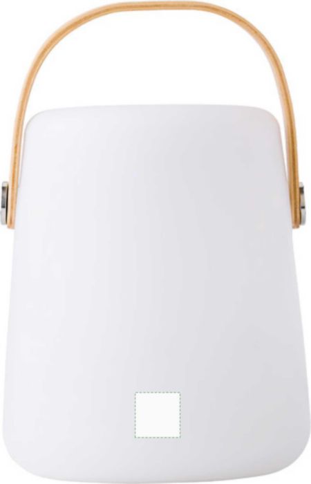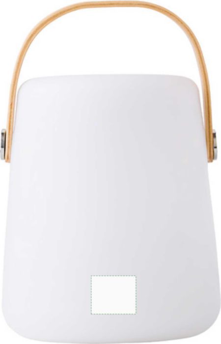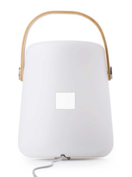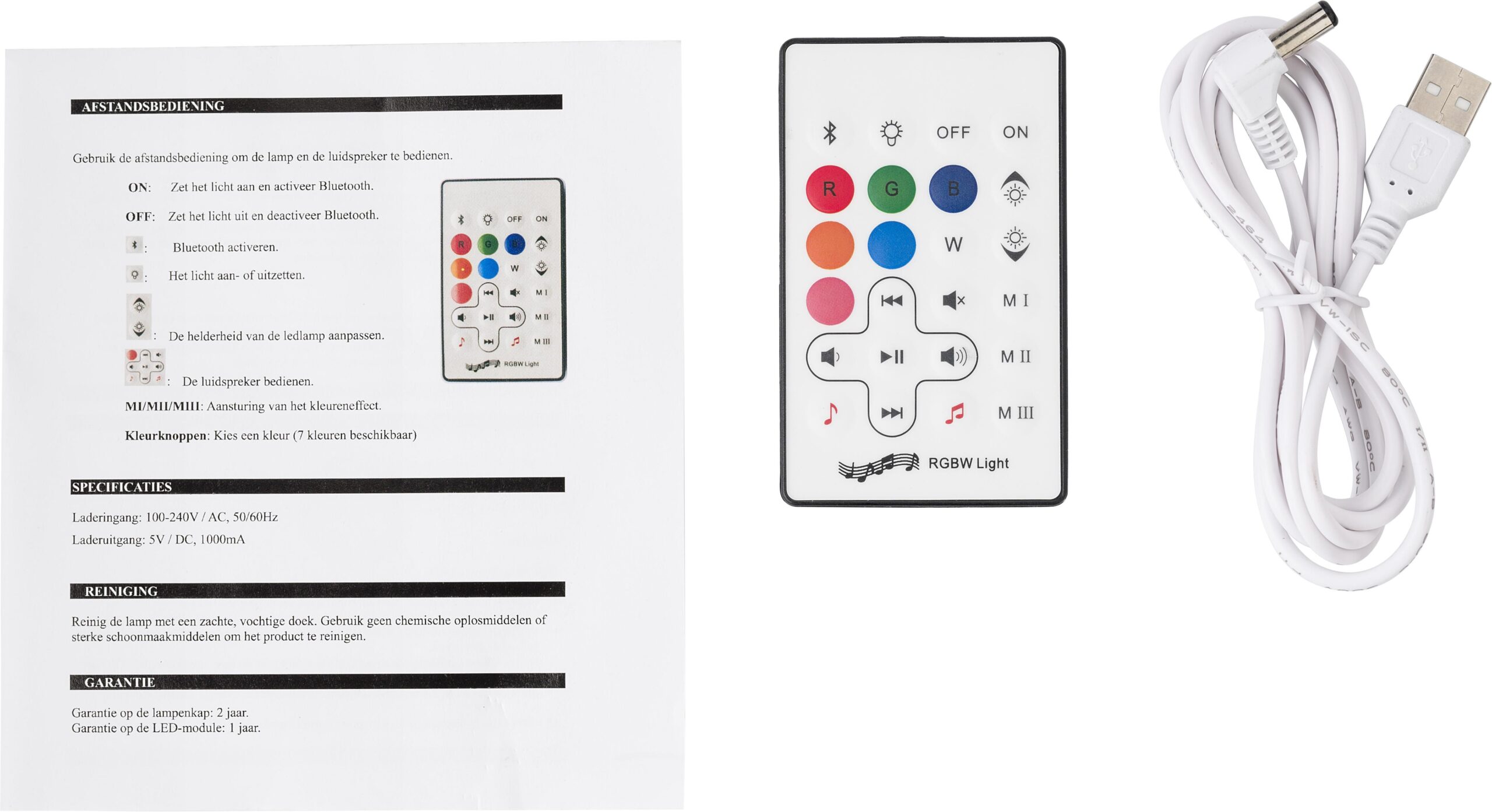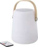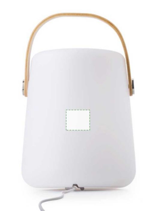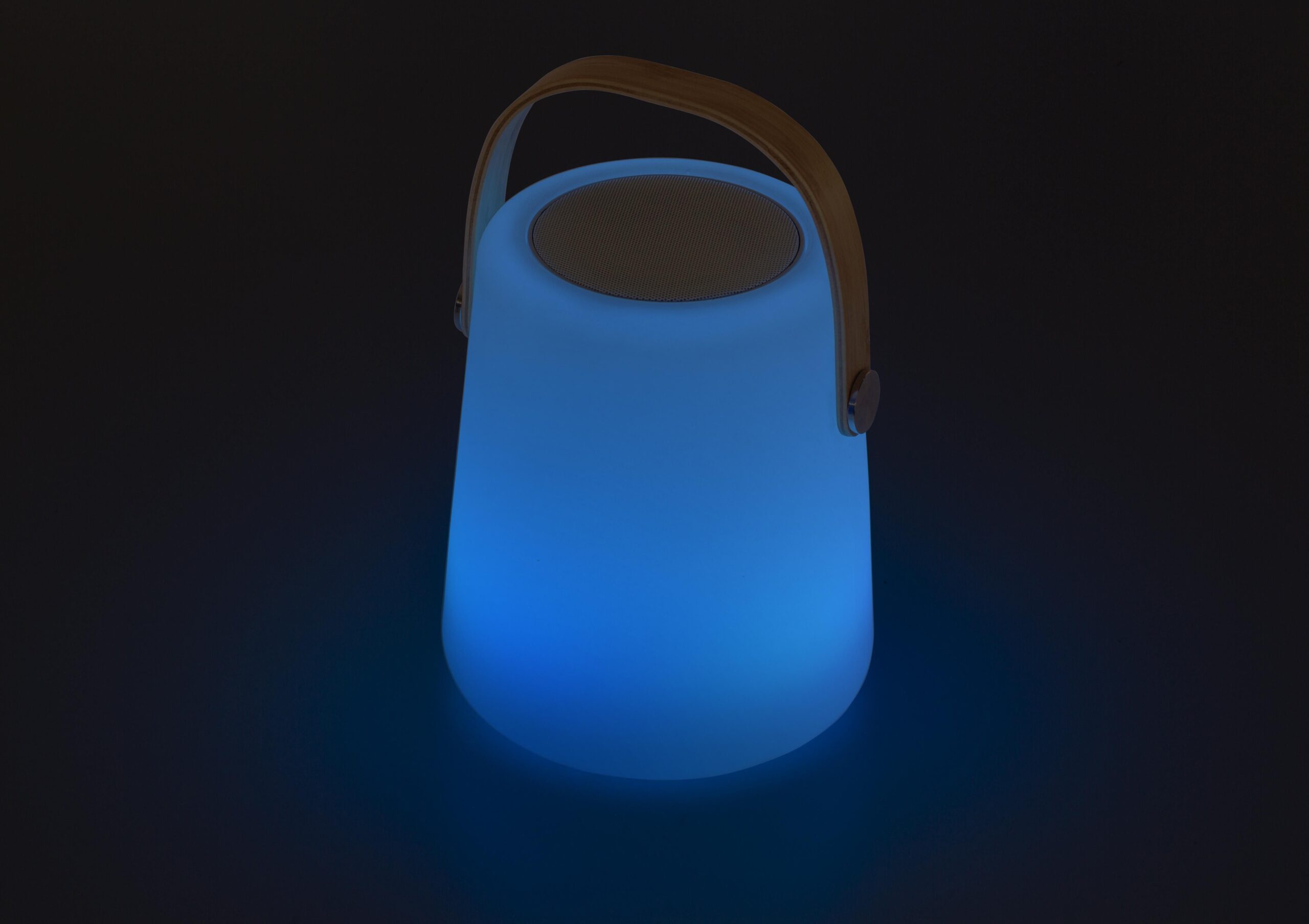 Trådlös högtalare i plast, med LED och handtag. LED-lampor kan ändra färg. Ingång 100V – 240V, 50/60Hz. Utgång: 5V/1A. Vattentät klass IP44. Inklusive fjärrkontroll och USB-kabel.