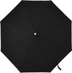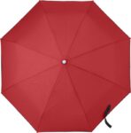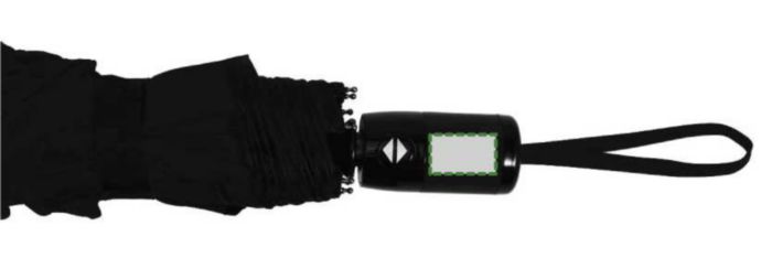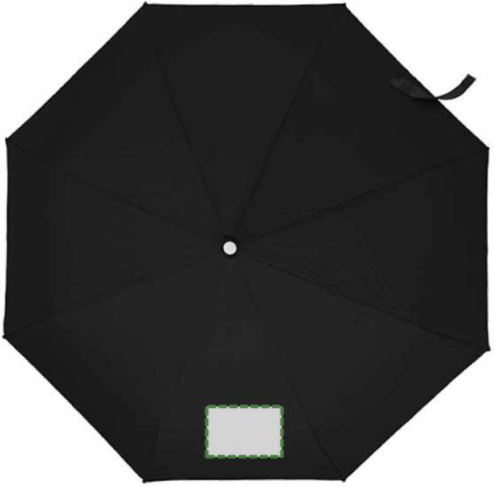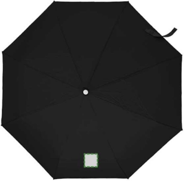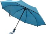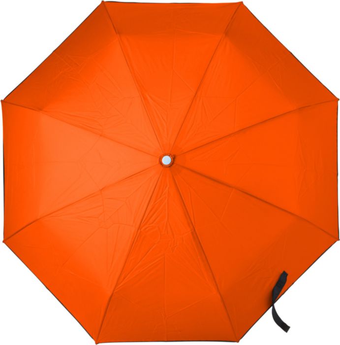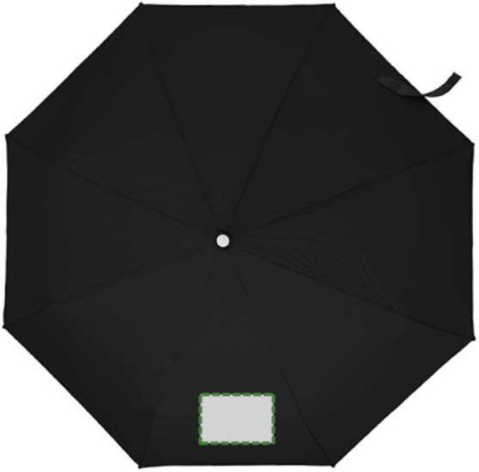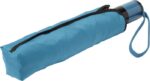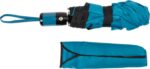 Hopvikbart kompaktparaply, stormsäkert, med paneler i pongee, metallram, spröt i glasfiber och handtag i plast. Matchande tygfodral.