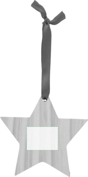 Julgranshänge i trä i form av en stjärna. Figuren levereras med ett rött band för upphängning.