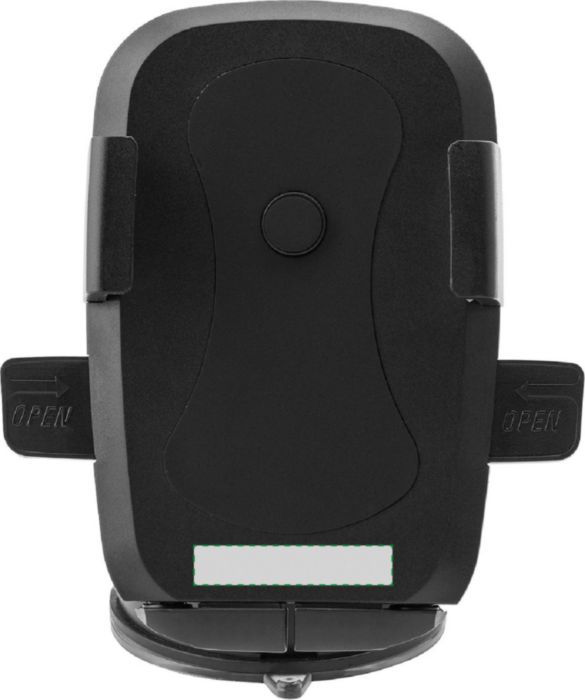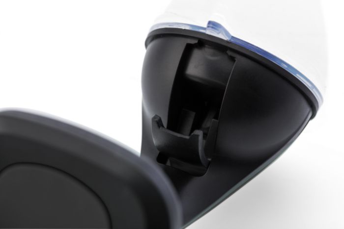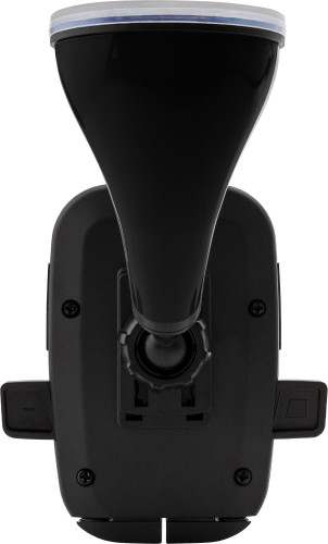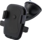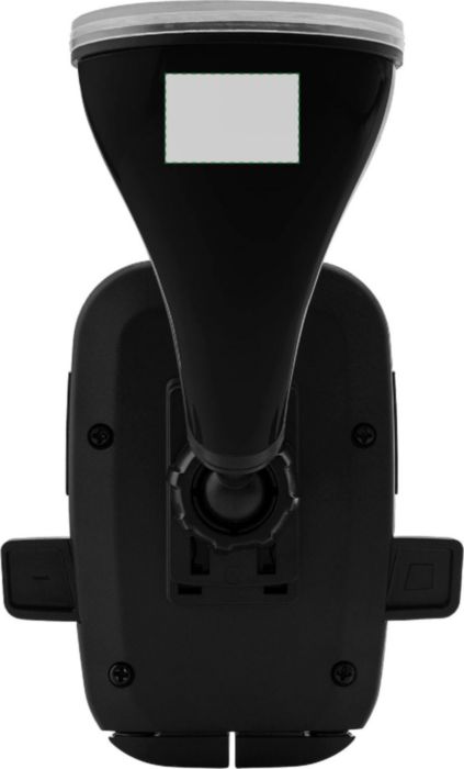 Justerbar mobiltelefonhållare i plast, enkel att fästa på instrumentbrädan eller fönstret med en stor sugkopp i botten. Fästena kan expandera till 81 mm, när knappen trycks in dras fästet in.