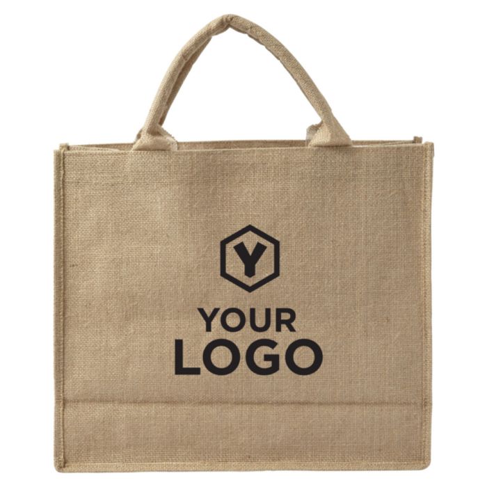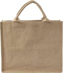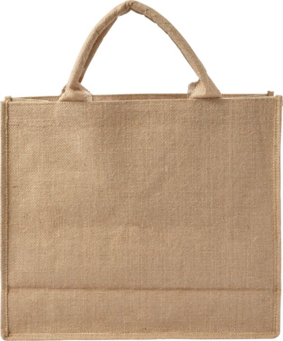Kasse i jute med korta handtag och laminerad insida.
