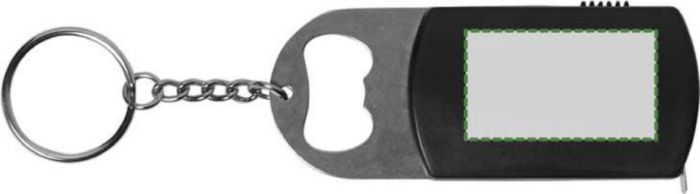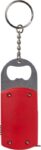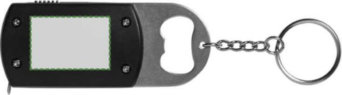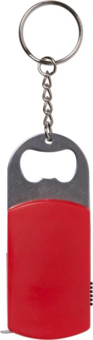 Kapsylöppnare i med nyckelring i stål. Med LED-lampa och 1 meter måttband. Batterier ingår.