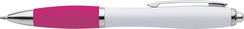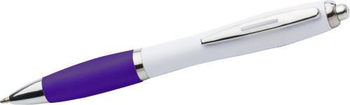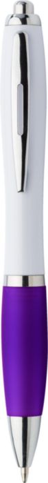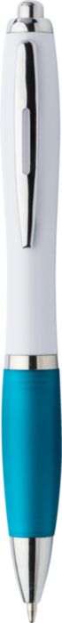 Kulspetspenna i plast med färgad gummitop. Blått bläck.