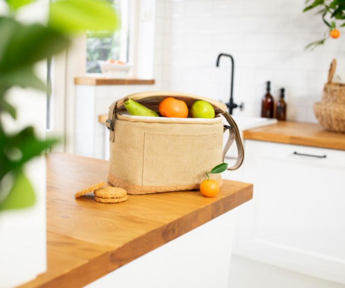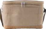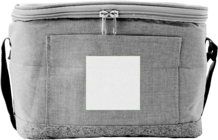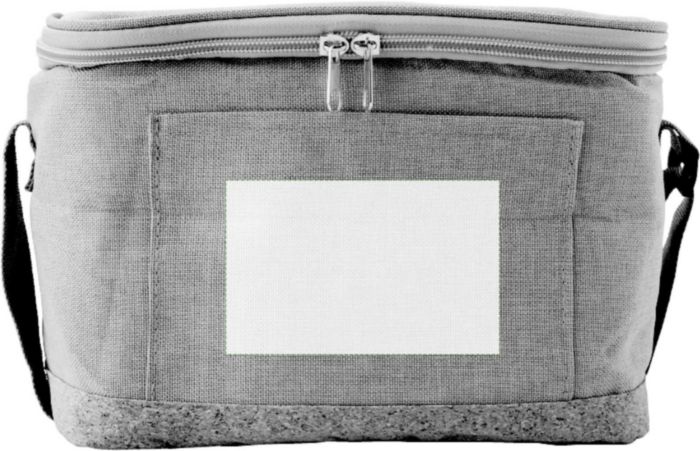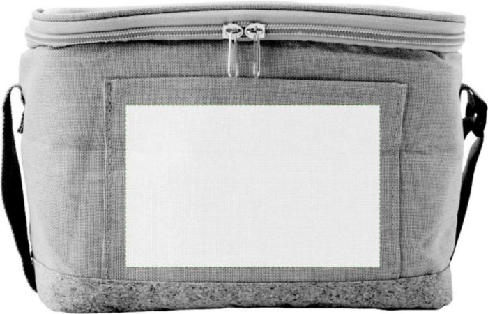 Kylväska av RPET-polyester (600D) med botten av kork. Insida av PEVA. Liten ficka på framsidan. Justerbar rem. Med RPET-etikett.