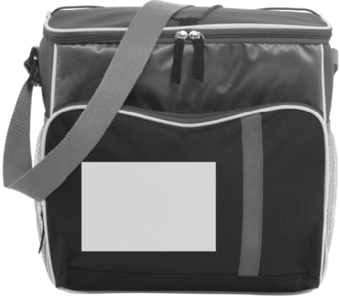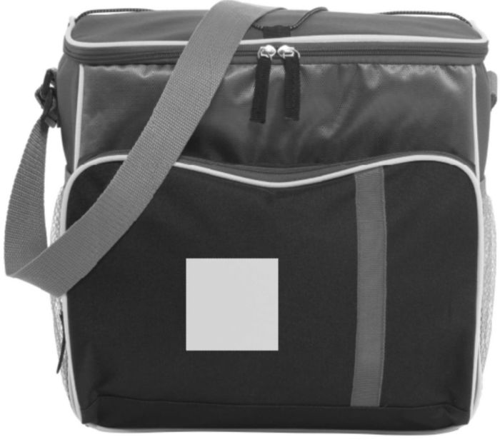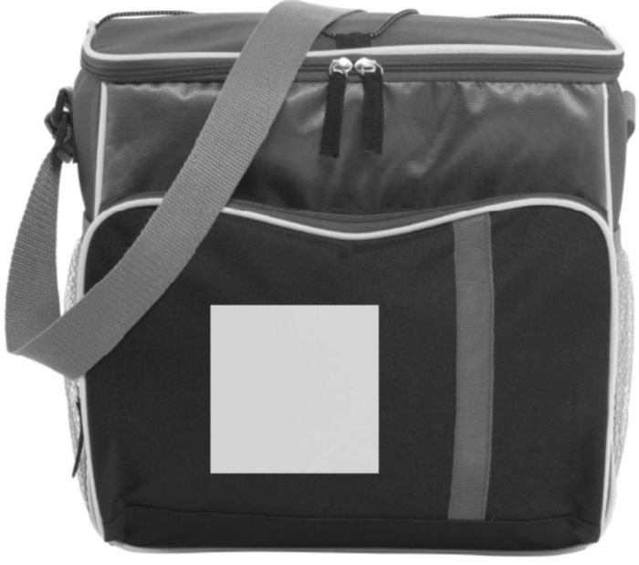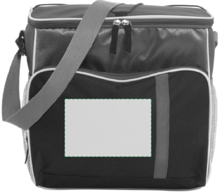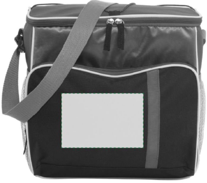 Kylväska i 600D polyester, ficka på framsidan med färgad dragkedja, huvudfack i 420D i svart dobby-material. Grå nätfickor på sidorna med elastiskt band i toppen. På väskans lock finns ett elastiskt snöre att fästa t ex picnicfilten med. Väskans baksida ä