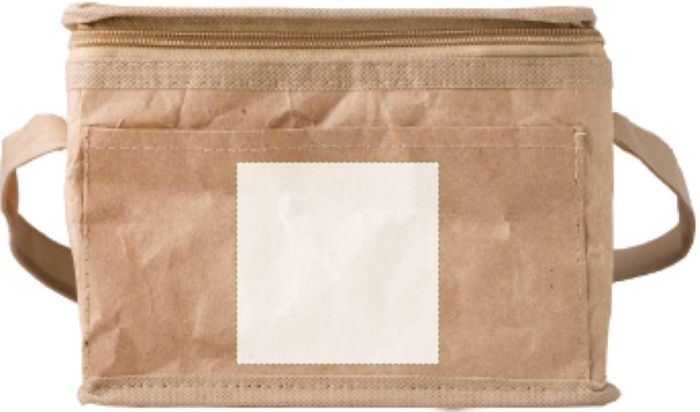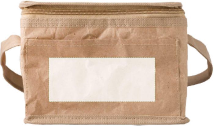 Papper (80gr/m²) vävd kylväska med aluminiumfolie på insidan, för sex 330 ml burkar. Med framficka och rem. Volym: 3 liter.