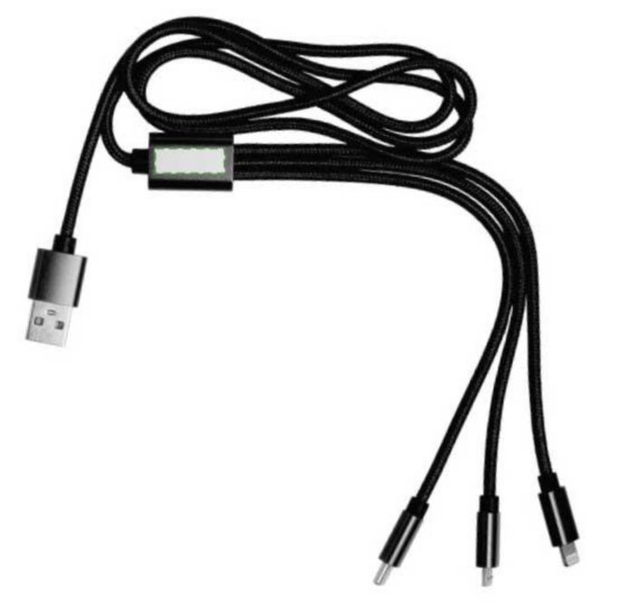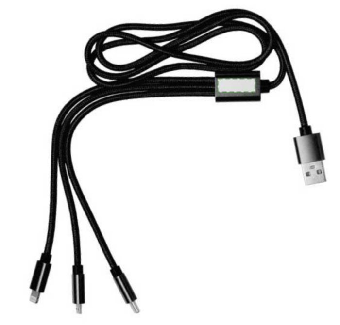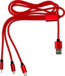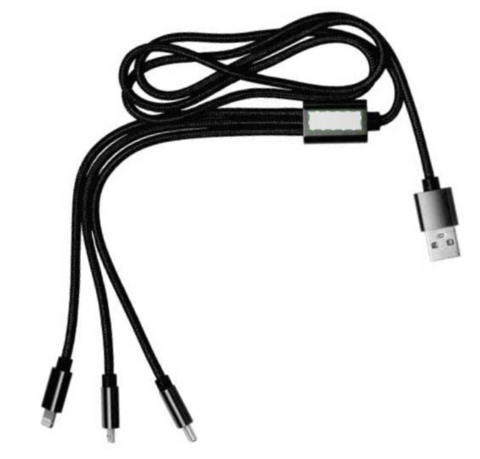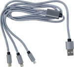 Laddningskabel i nylon med USB i ena änden och i andra änden micro USB, USB-C och lampa.