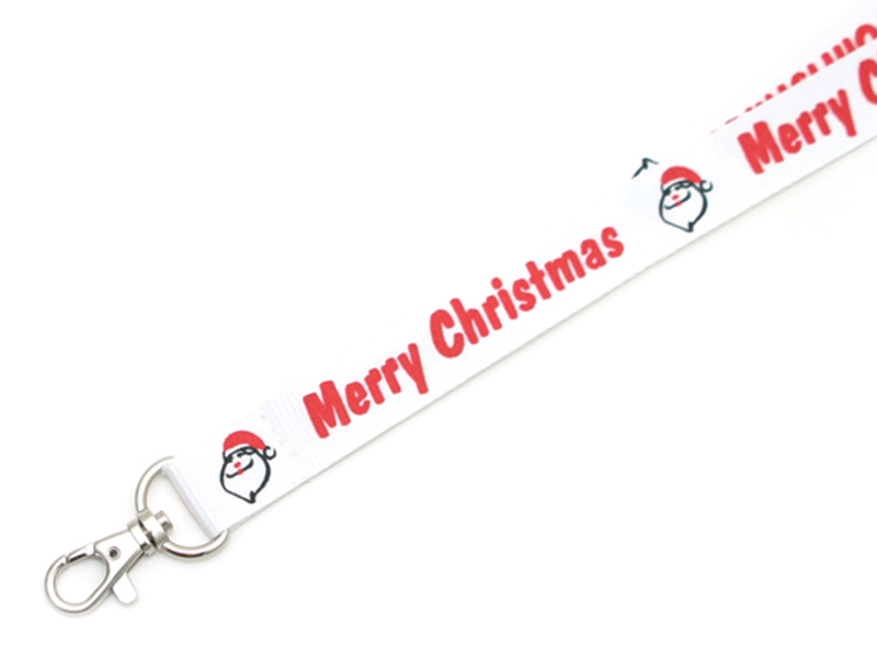 Plant polyesterband med karbinhake och säkerhetsfäste. Julmotiv med tomte och julhälsning på engelska. Lagervara.