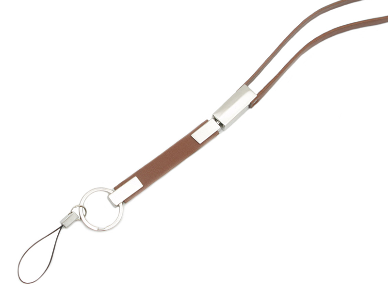 Snyggt band i läderlook med tillbehör i metall. Splitring och mobilfäste.