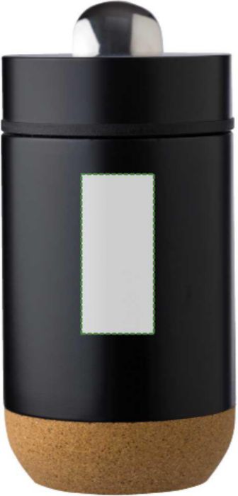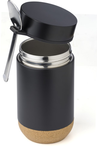 Lunchbox med dubbla väggar, korkbotten och rostfri sked. Skeden kan fästas på sidan. Individuellt förpackad i brun kartong.