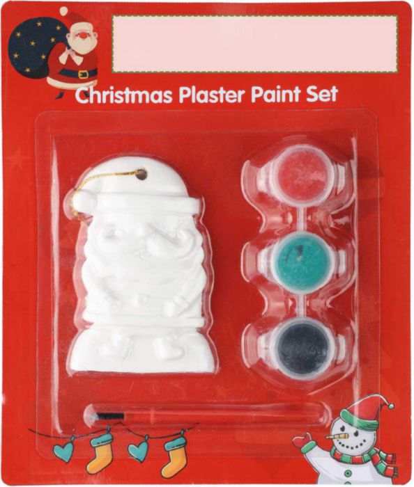 Tomtemålningsset med en gipsfigur, tre akrylfärger och en pensel. Har ett hål med polyestersnöre för att hänga upp som julgransdekoration. Ungefärlig färgläggningstid: 30–60 minuter. Förpackad per styck.