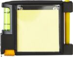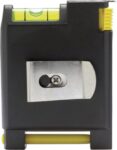 Måttband, 2 m, med vattenpass, anteckningsblock, penna och bältesklips i metall. Huset i plast.