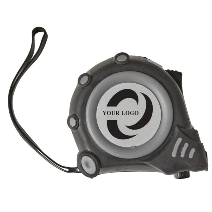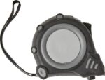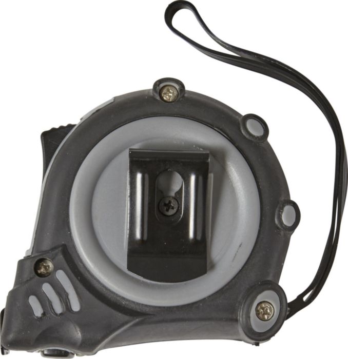 Måttband (5 meter) med måttskalor för cm och tum. Med bältesclip och handledsband.