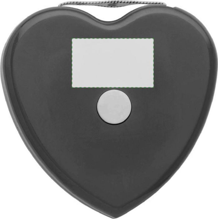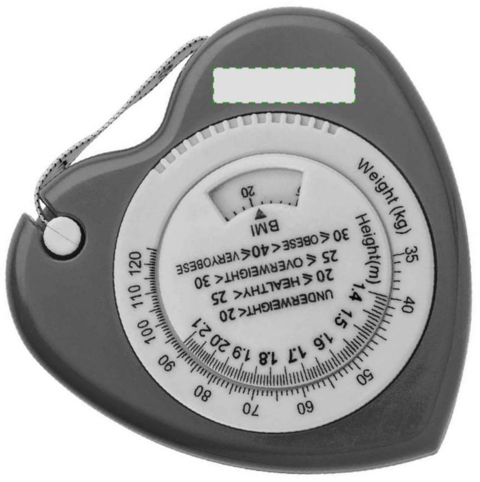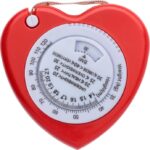 Måttband med BMI-skala (Body Mass Index), 1,5 m långt. Av plast, i form av hjärta, med en vit stoppknapp. Med vikt- (kg) och längd- (m) indikator på framsidan. För reklamsyften, ej medicinsk användning.