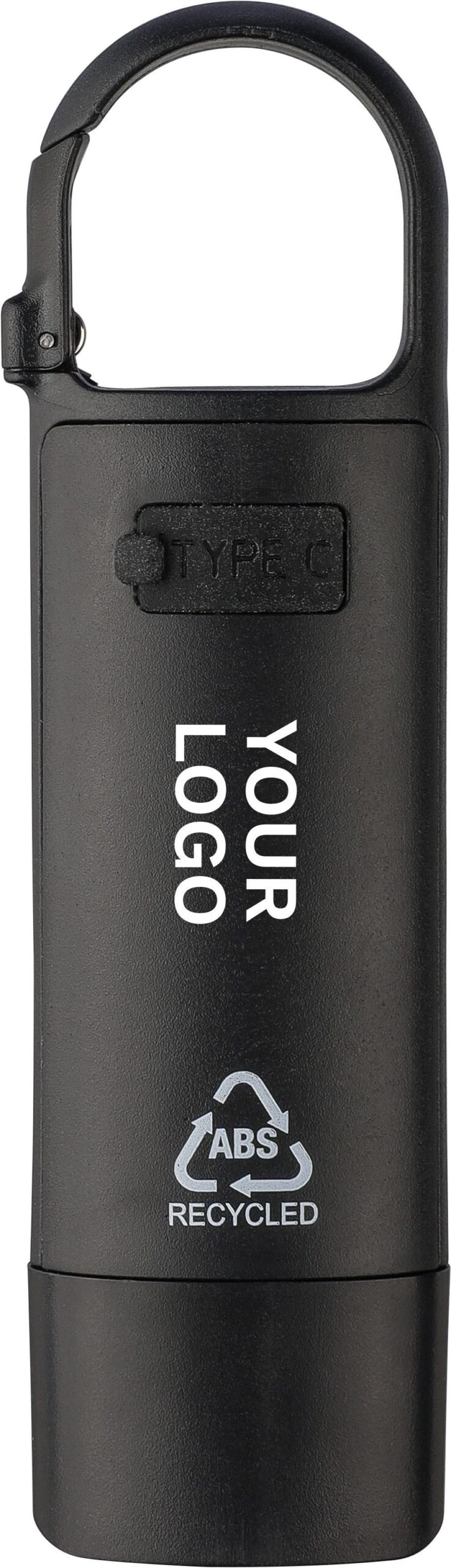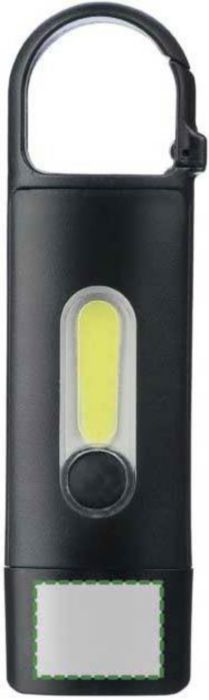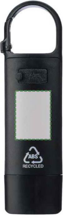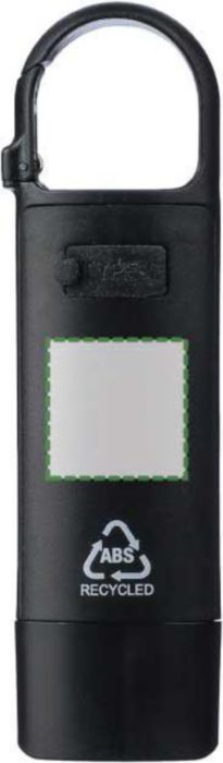 Minificklampa tillverkad av återvunnen plast med inbyggt 200 mAh USB-laddningsbart batteri och karbinhake. COB-lampa på framsidan och COB-strålkastare på sidan med tre ljuslägen. Inkluderar USB-C-laddningskabel och logotyp tillverkad av återvunnen plast. Individuellt förpackad i en brun kartong.