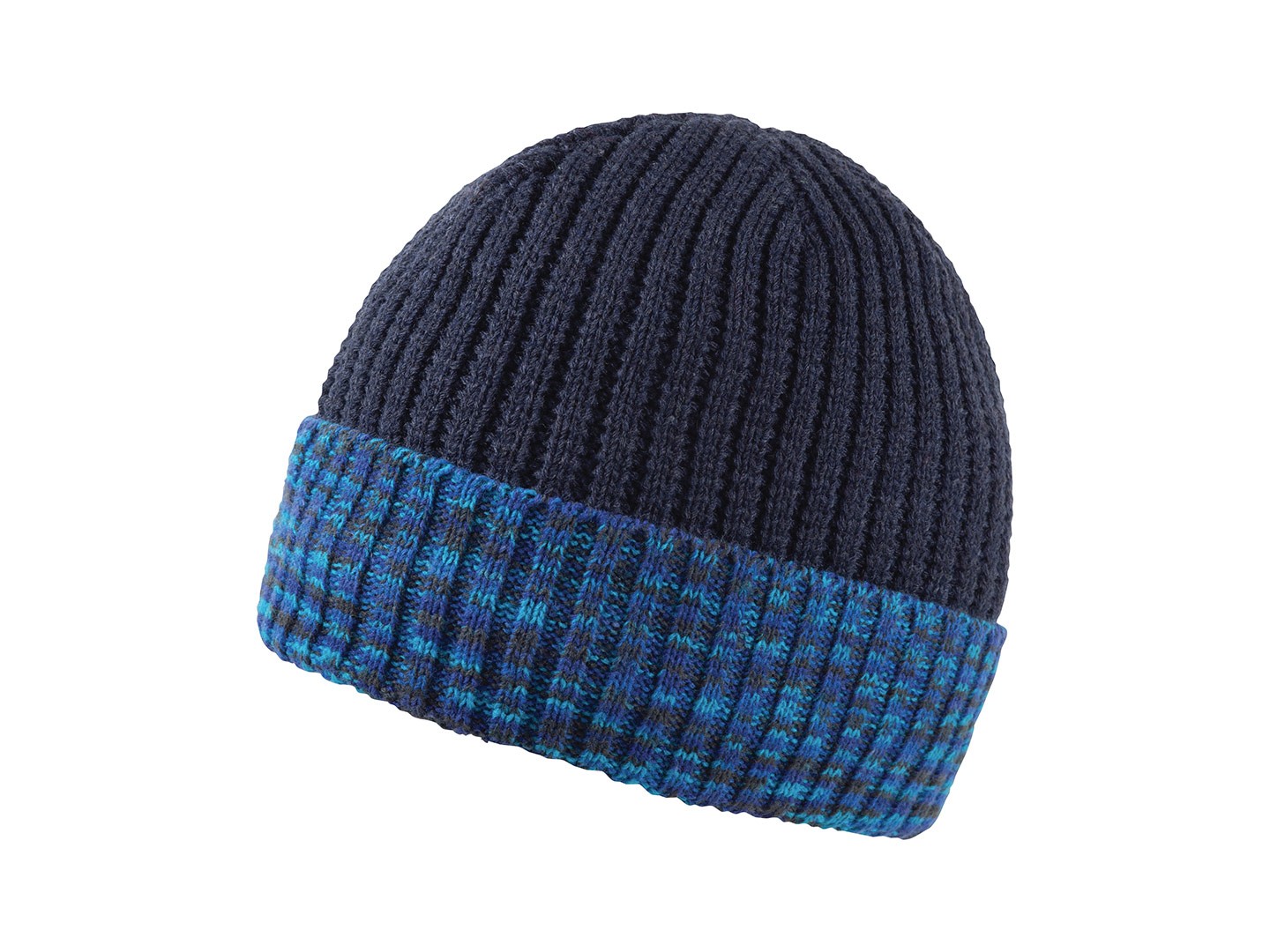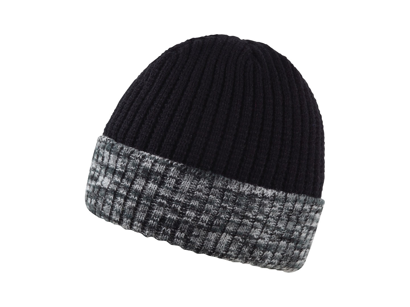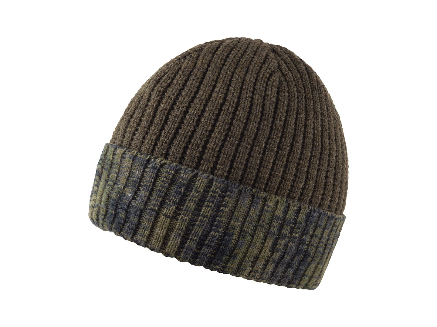 Ribbstickad mössa med camomönster på en del av produkten. Foder i helfleece.