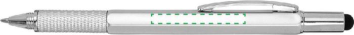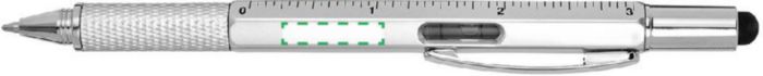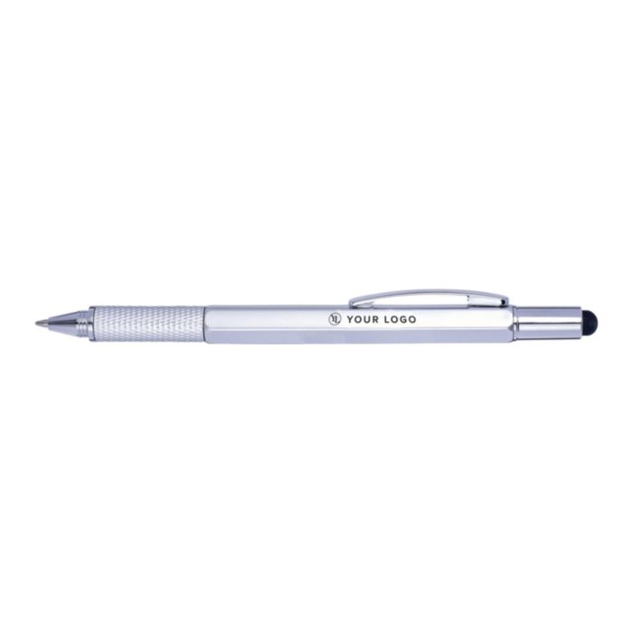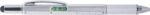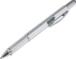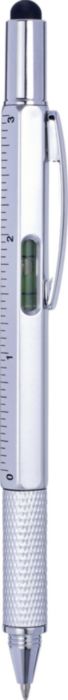 Multifunktionell kulspetspenna i plast med twistmekanism. Utrustad med ett vattenpass och linjal på sidan samt gummitopp för touchskärmar. Svart bläck.