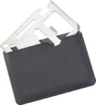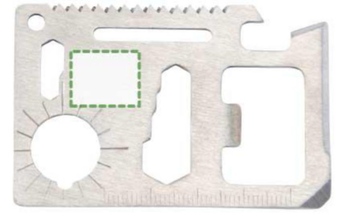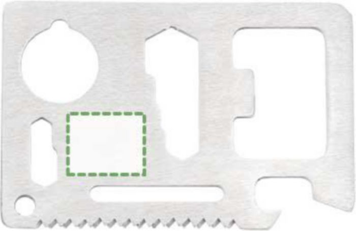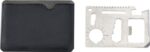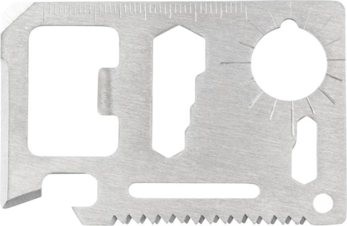 Multiverktyg i rostfritt stål med elva funktioner; kniv, konservöppnare, vingmutter, såg, skruvmejsel, flasköppnare, linjal och skriftnycklar i olika storlekar. Levereras i en påse av PU.