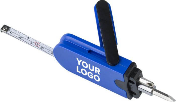 Multifunktionellt verktyg i metall och plast med platthuvud i två storlekar och Phillips-skruvmejslar och måttband (1 meter).