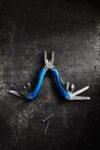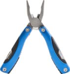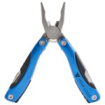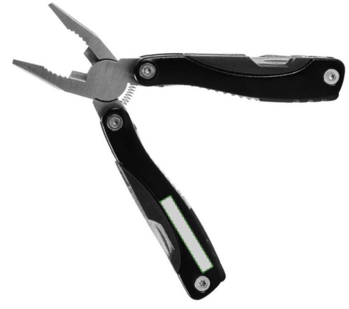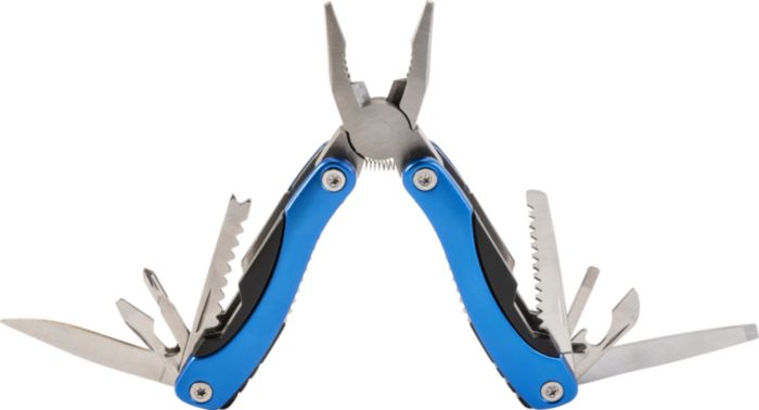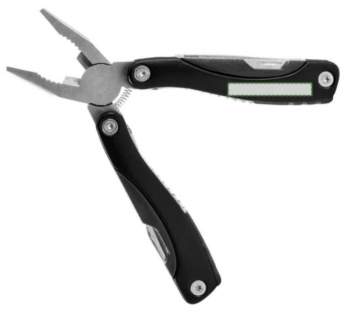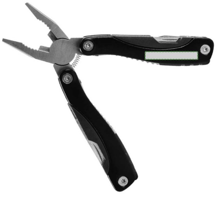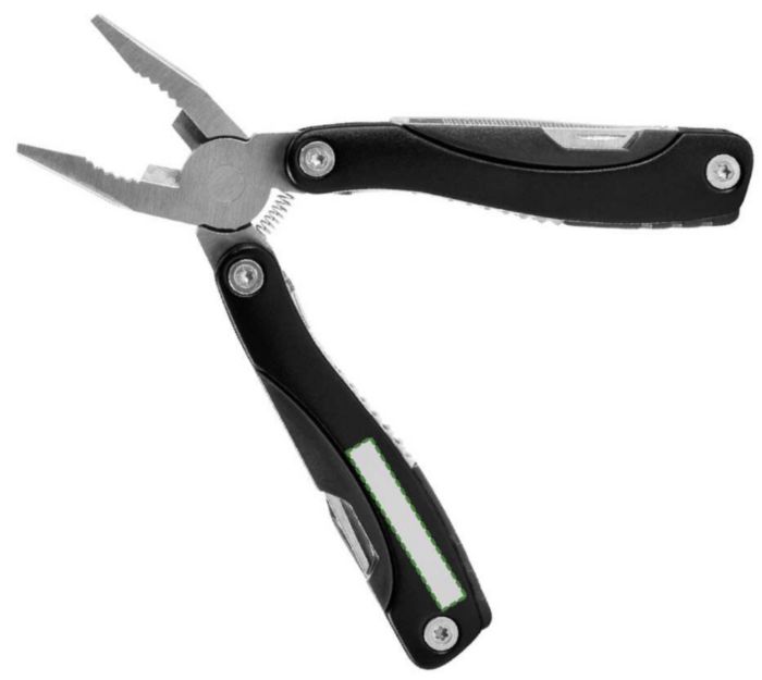 Multifunktionellt vertyg i metall med detaljer i ABS. Verktyget består av två tänger, en såg, en kniv, två skruvmejslar (en spår- och en stjärnmejsel), en fil, en flasköppnare, en fiskskrapa, en nötknäppare och en linjal (inch).