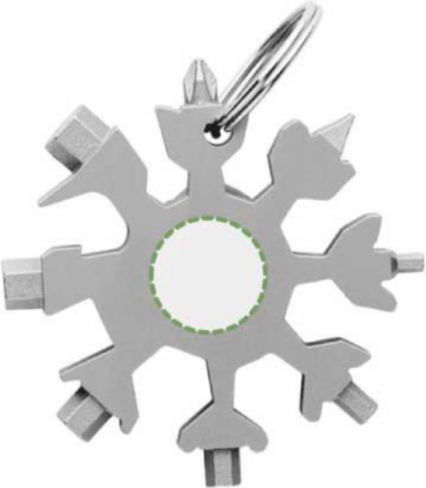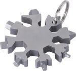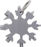 Multiverktyg i rostfritt stål med 17 funktioner (spårskruvmejsel, öppnare, skiftnyckel, snökniv och flera storlekar på sexkantsnycklar). Inkluderar nyckelring. Formad som en snöflinga. Individuellt förpackad i en brun kartonglåda.