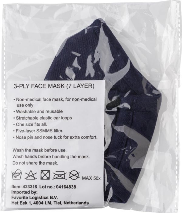 Munnskydd i bomull, återanvändningsbart. Masken har näsclip och formad för komfort. Masken har sju lager (5-lagersfilter med småltblåst SSMMS-filter) och har en bakteriefiltrering på 95 %. Lämplig för handtvätt. Icke-medicinsk.
