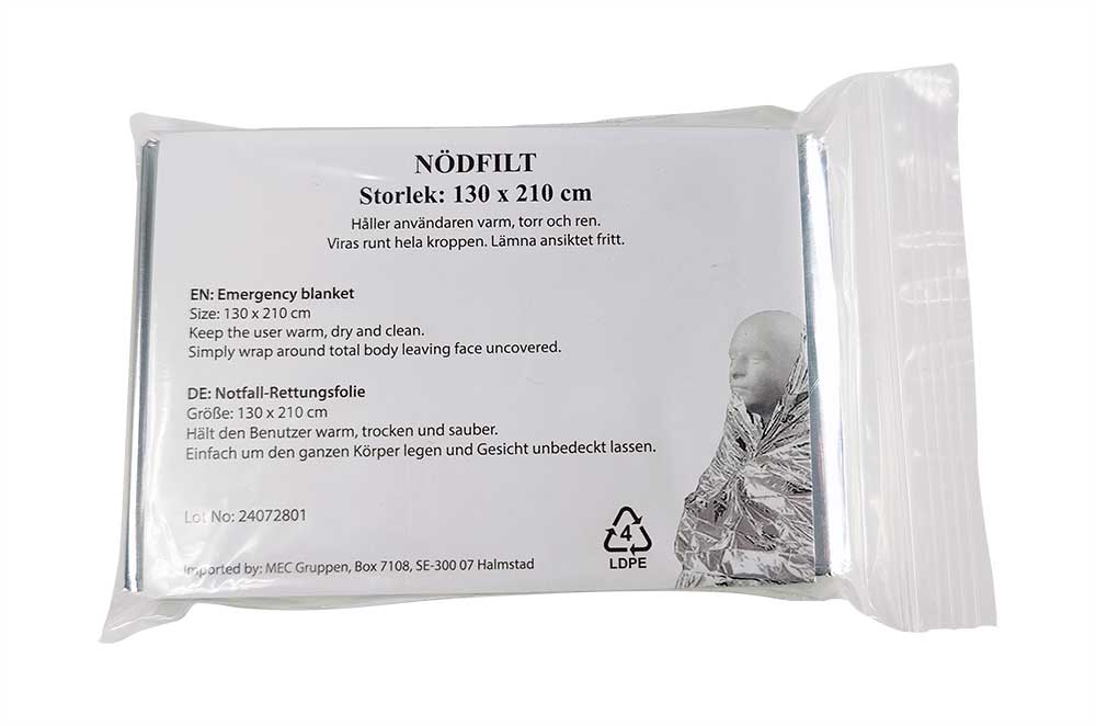 Värmefilt i aluminiumfolie. Leveras hopvikt i en polypåse.